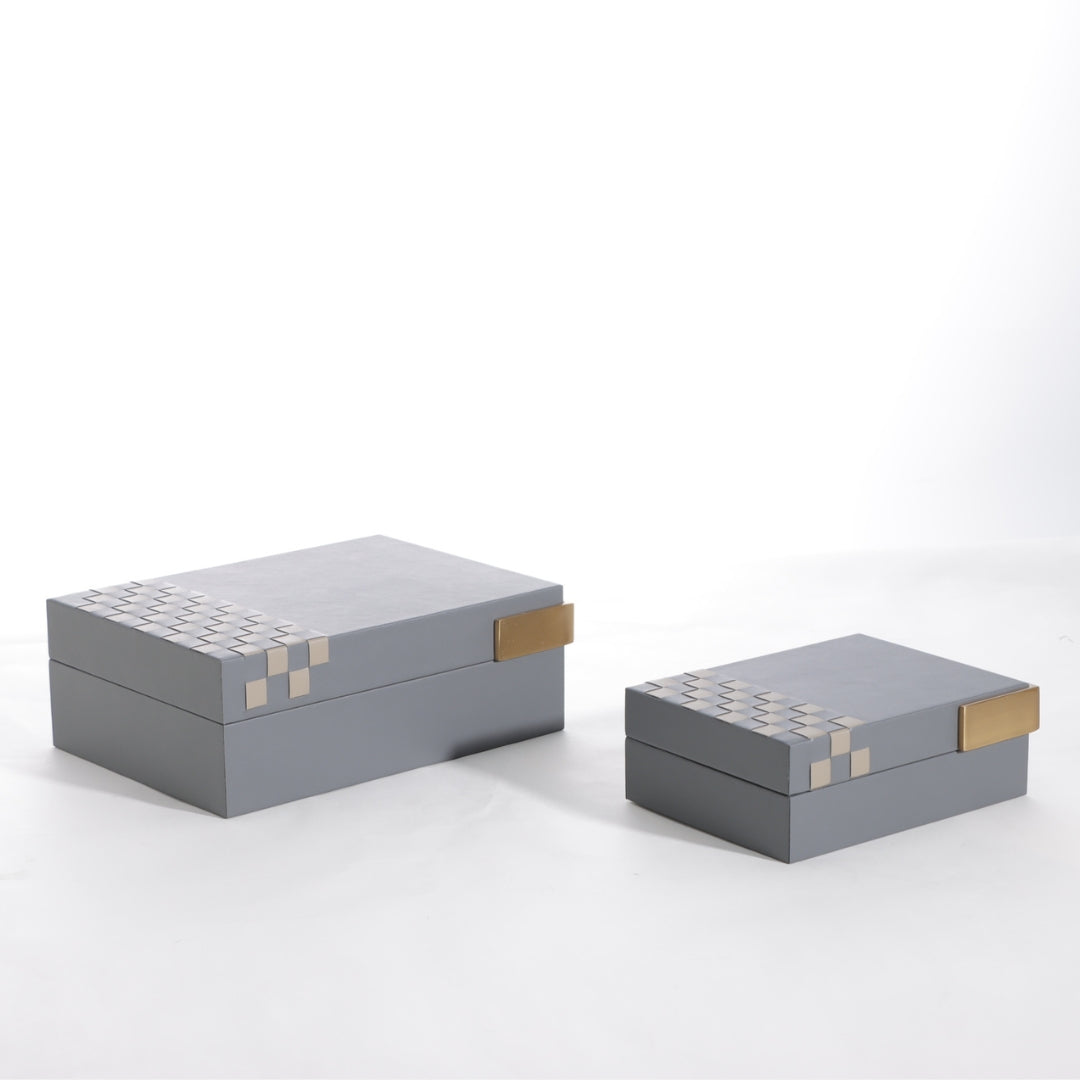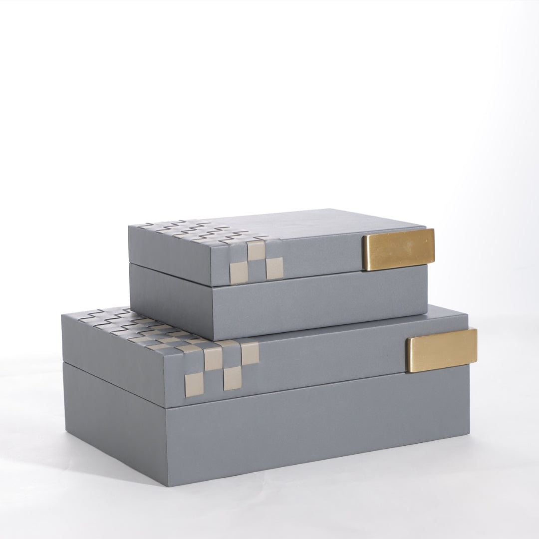Experience artisanal craftsmanship with our Artisan Grey & Khaki Hand-Woven Microfiber Storage Box - Small. This small storage box is meticulously hand-woven from luxurious microfiber leather, accented with antique brass hardware. Its exquisite combination of grey and khaki adds a touch of artistry to your space. Store your essentials in style while appreciating the craftsmanship that went into its creation. Immerse yourself in the world of artisanal luxury.