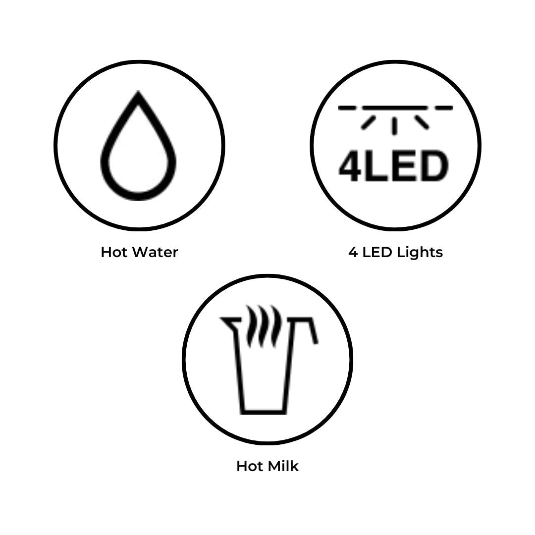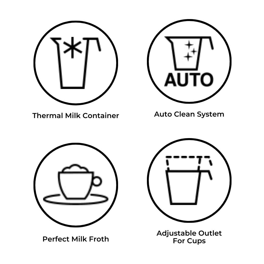 - Indications in display : Cleaning brewing unit, Empty water container, Full drip tray, Empty coffee beans container