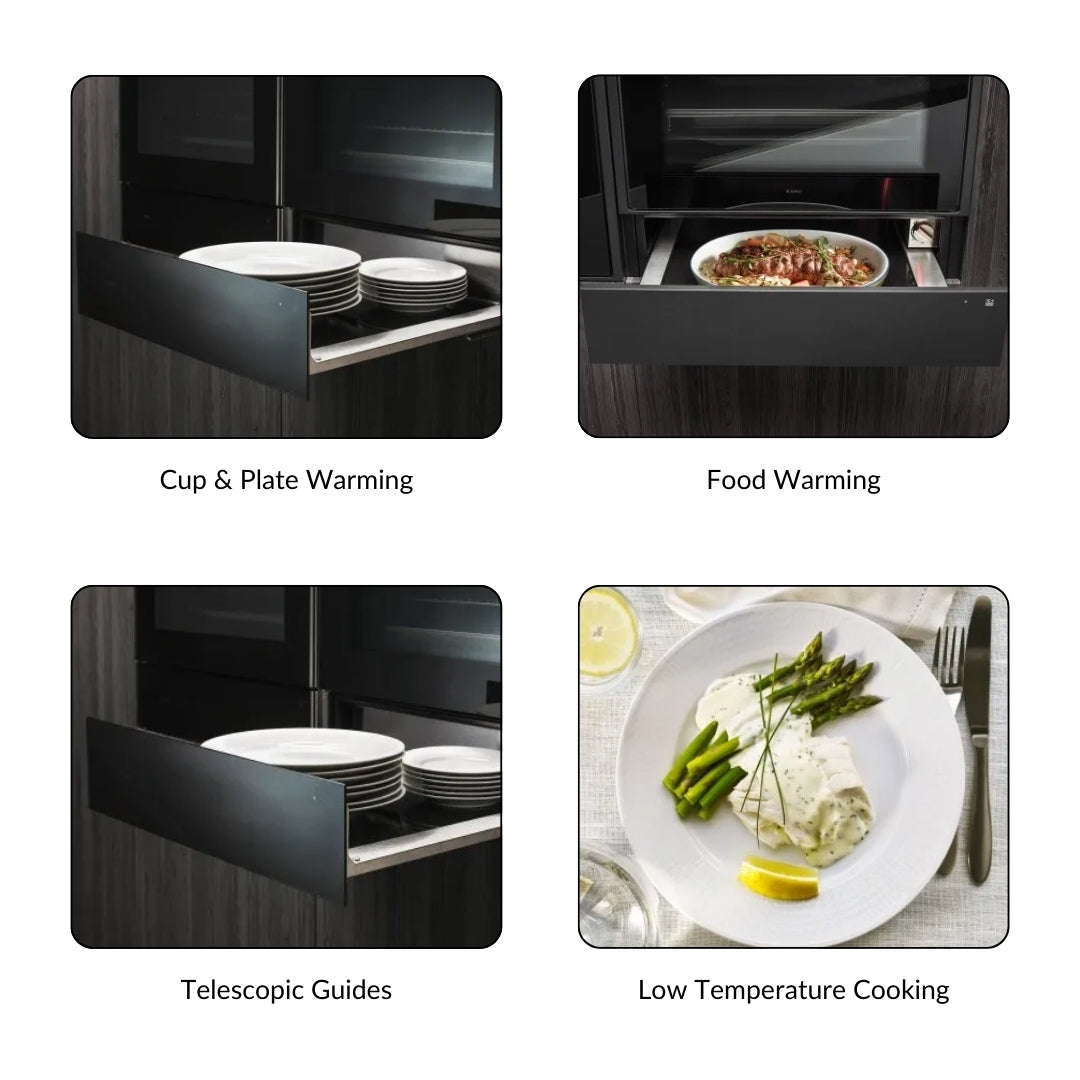 - Functions, programs and modes : Keeping food warm and reheating, Warming of dishes, Slow cooking, Manual temperature setting and timer, Defrosting of food, Warm preservation, Warming of cups, Warming crockery