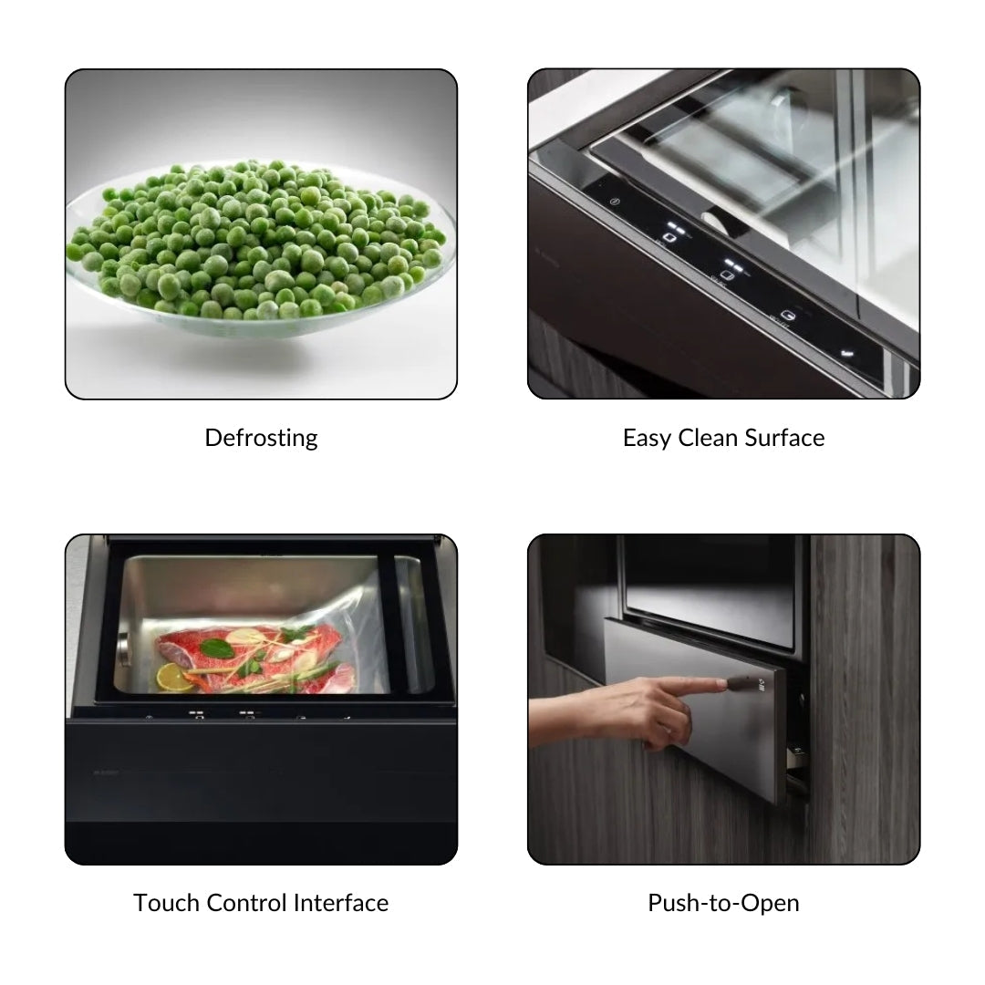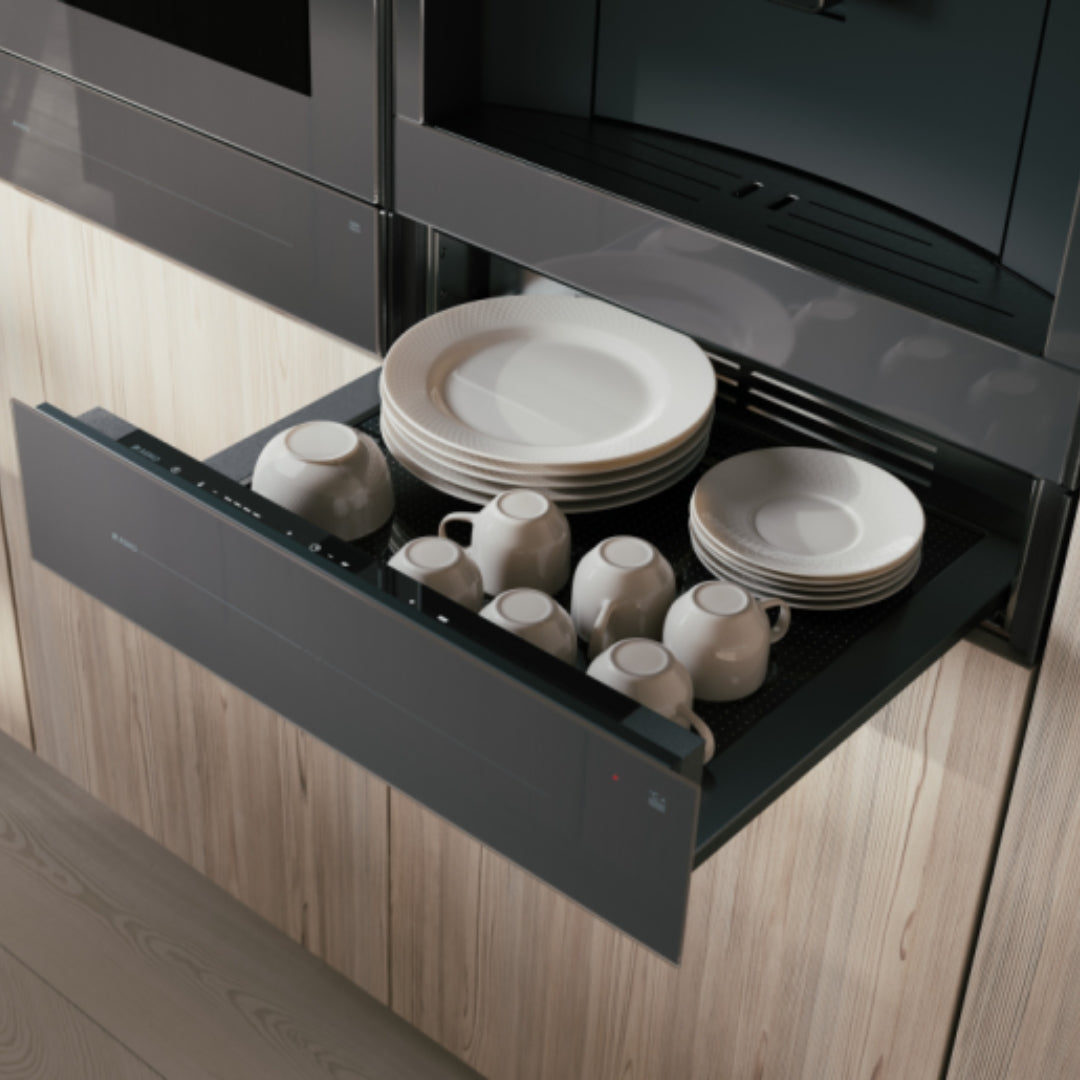 - The warming drawer is perfect for heating plates before a dinner party, or warming cups to serve hot coffee in. It holds 20 plates in 28 cm diameter, or 80 coffee cups, or 40 tea cups.