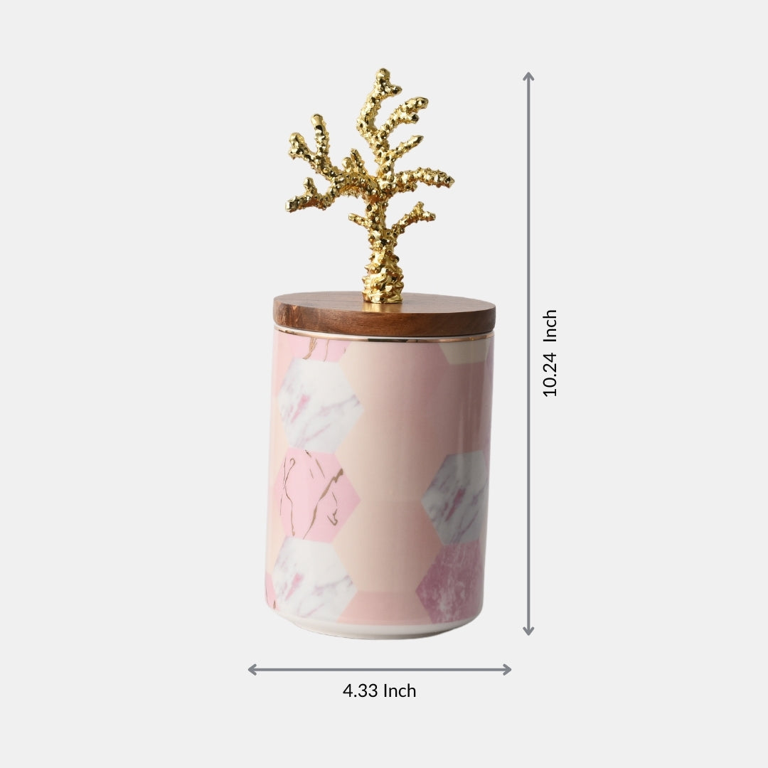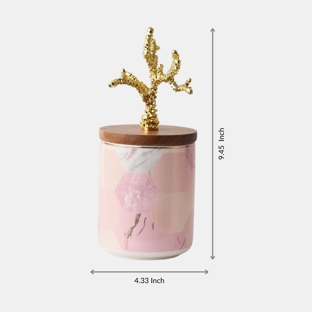 This pastel pink ceramic storage box, adorned with an airtight wooden cap and beautified with a tropical pull-out, is a delightful combination of form and function. Crafted with precision, it adds a pop of color and a touch of tropical allure to your storage solutions. The airtight wooden cap ensures the freshness of your stored items. Whether used for storing snacks, tea, or as a decorative piece, it becomes a symbol of practical elegance. With this storage box, you're not just organizing; you're adding a touch of the tropics to your space.