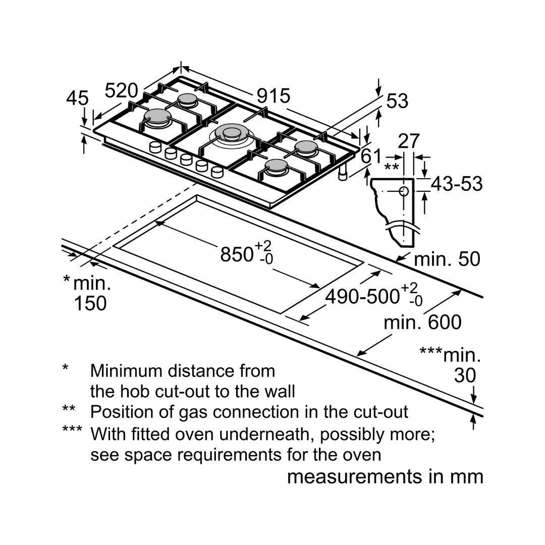 - Cut out dimensions (HxWxD): 45 x 850-852 x 490-502 mm