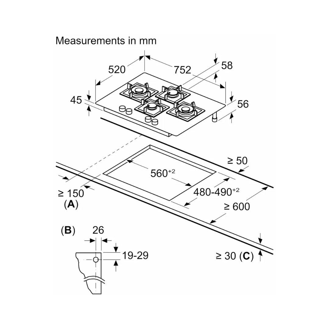 - Cut out dimensions (HxWxD): 45 x 560-562 x 480-492 mm