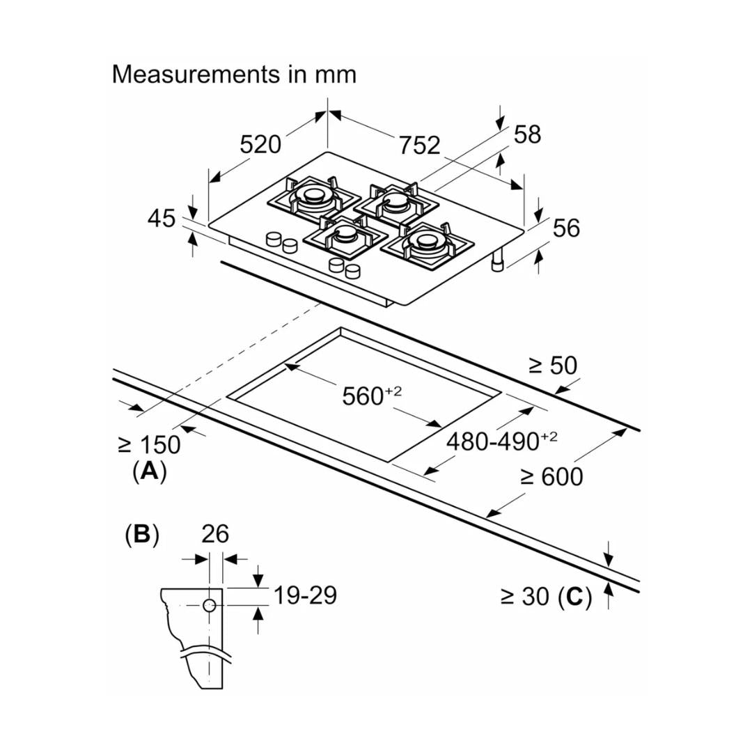 - Cut out dimensions (HxWxD): 56 x 752 x 520 mm