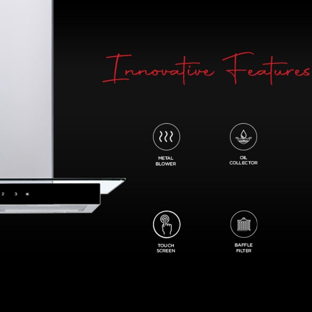 - Elegant T-shaped Chimney. Full Stainless Steel Body with Glass Top. Non-choking Baffle Filter for Easy Cleaning