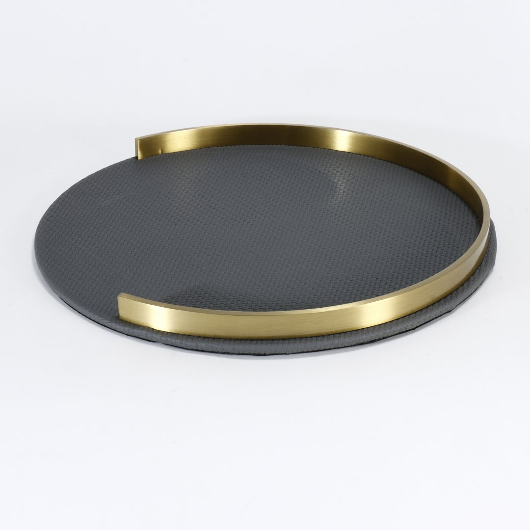 Introducing our Circular Elegance: Leather Tray with Stainless Steel Rim, a captivating fusion of timeless luxury and modern design. This round tray features a sumptuous leather surface, encircled by a sleek stainless steel rim, creating a harmonious blend of form and function.Each tray in this collection is a masterpiece of craftsmanship, meticulously designed with supple leather that exudes an understated opulence. The stainless steel rim provides a touch of contemporary sophistication and durability, making this tray both functional and a statement of refined taste. Whether you're serving cocktails or using it as a chic decor piece, it effortlessly elevates any setting.Our Circular Elegance Leather Tray with Stainless Steel Rim is more than just a serving accessory; it's a symbol of timeless refinement and practical luxury. Elevate your serving experience or enhance your decor with this exquisite round tray, where the fusion of leather and stainless steel creates an aesthetic that's both classic and modern, evoking a sense of enduring elegance and sophistication.