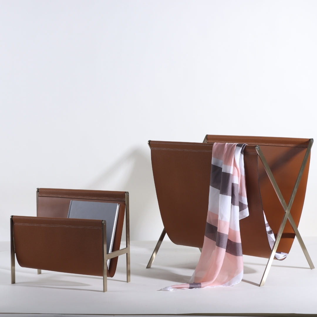 Elevate your organization with the Classic Collection: Bronze PU Leather & Stainless Steel Magazine Rack, a fusion of classic style and functionality. Crafted with meticulous detail from bronze PU leather and stainless steel, this magazine rack embodies timeless elegance. Its rich color and ample storage make it a versatile addition to any space. Whether for storing magazines or as a decorative accent, let this magazine rack be a symbol of your discerning taste, adding an air of classic organization and refinement to your decor.