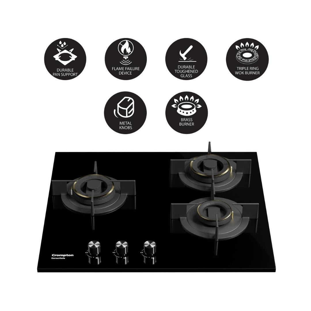 Crompton 60 cm 3 Burner Hob Sensosafe HOB-SSHB603-MBL