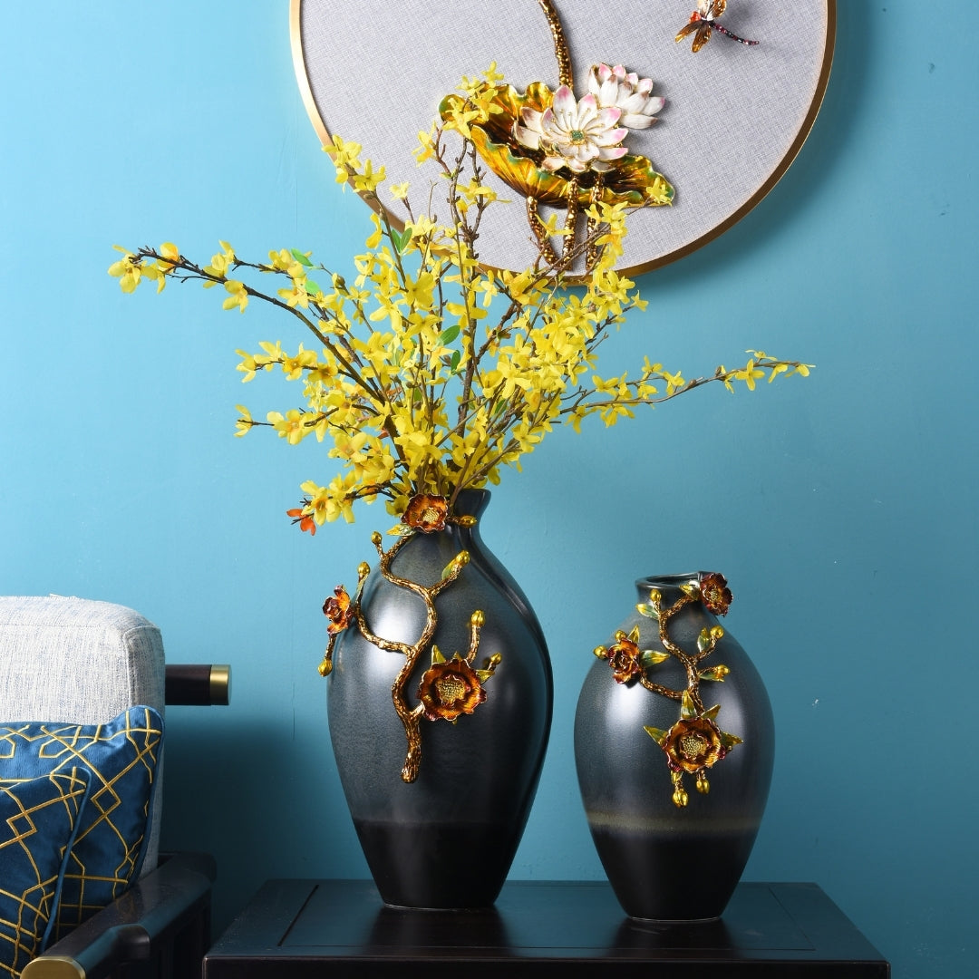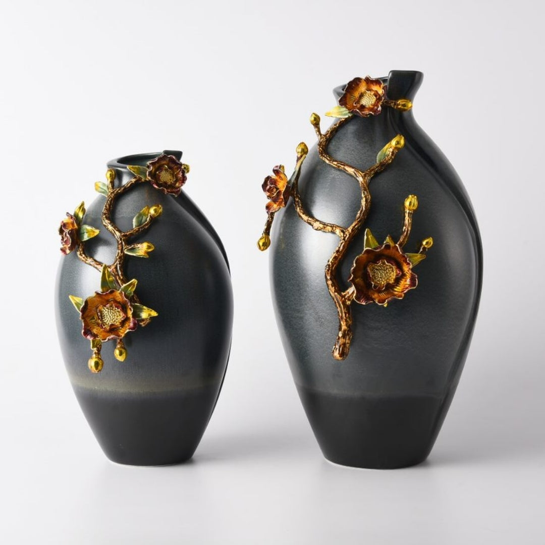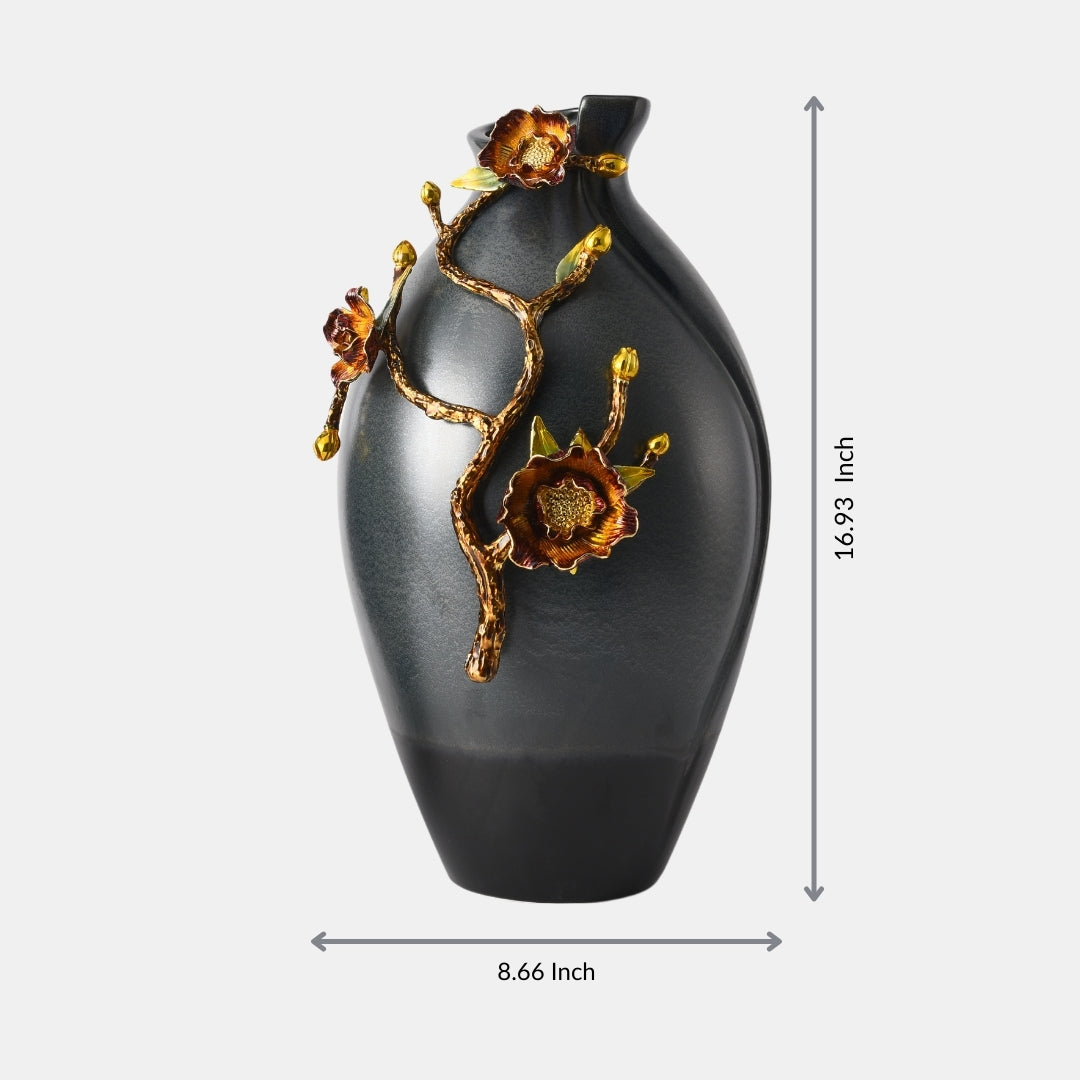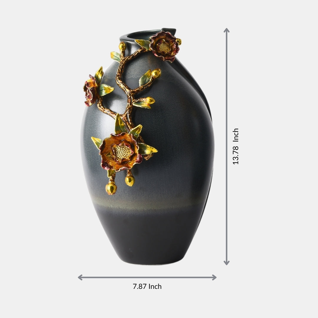 This greyish green vase is a mesmerizing blend of contrasting elements, capturing the essence of both darkness and the beauty of nature. Crafted with meticulous attention to detail, it showcases a sleek black hue that adds an air of mystery and drama to your decor. The delicate floral branch accent celebrates the grace of nature's design, creating a captivating juxtaposition. Whether displayed on your shelf or table, it becomes a symbol of the harmony between the enigmatic and the exquisite.