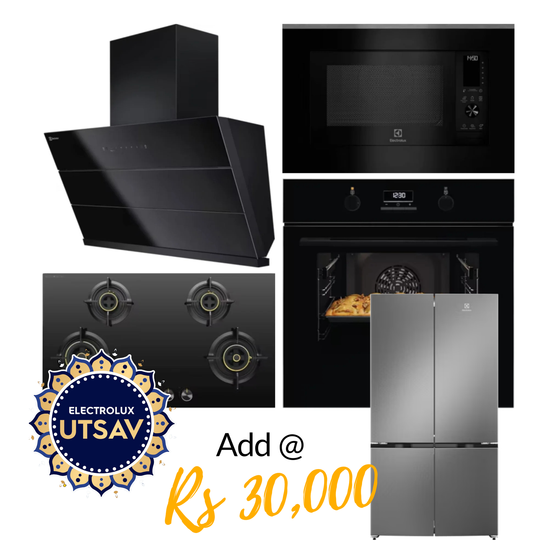 ElectroluxElectrolux Oven UltimateTaste 500 KOD3H50BK + Microwave with Air Fryer UltimateTaste 900 EMSB30XCF + Chimney UltimateTaste 700 Series ECS9932KB + Hob UltimateTaste 300 EHG9430BCI with Festive Price RefrigeratorRs. 215,480.00 View details