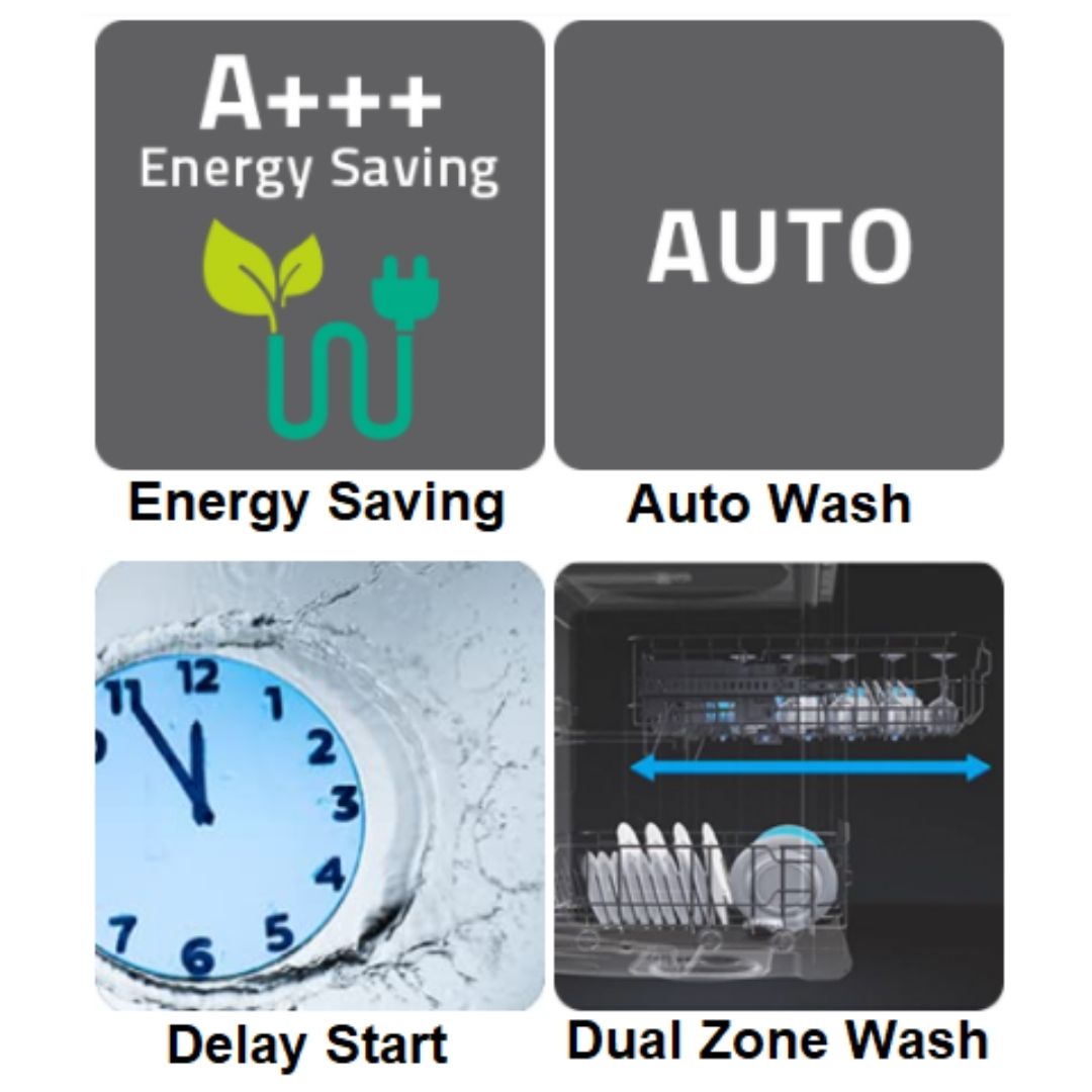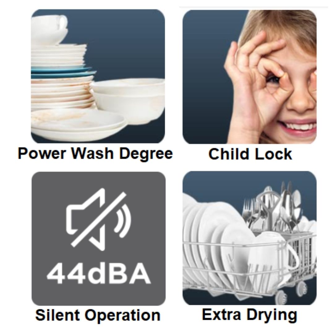 - 8 Washing Programs : Intensive, Normal, Eco, 90 Min, Glass, Rapid, Soak -Pre Wash and Auto Wash