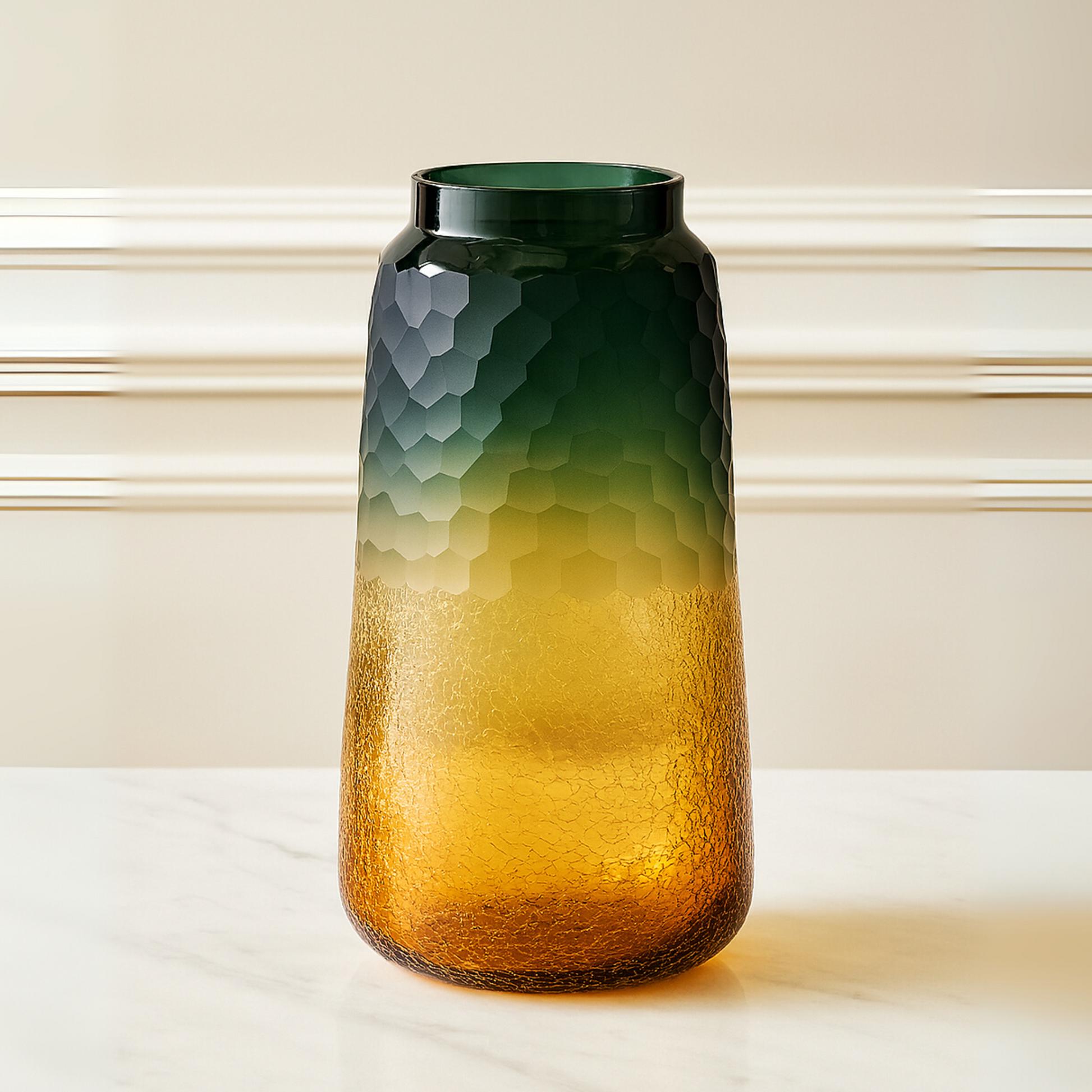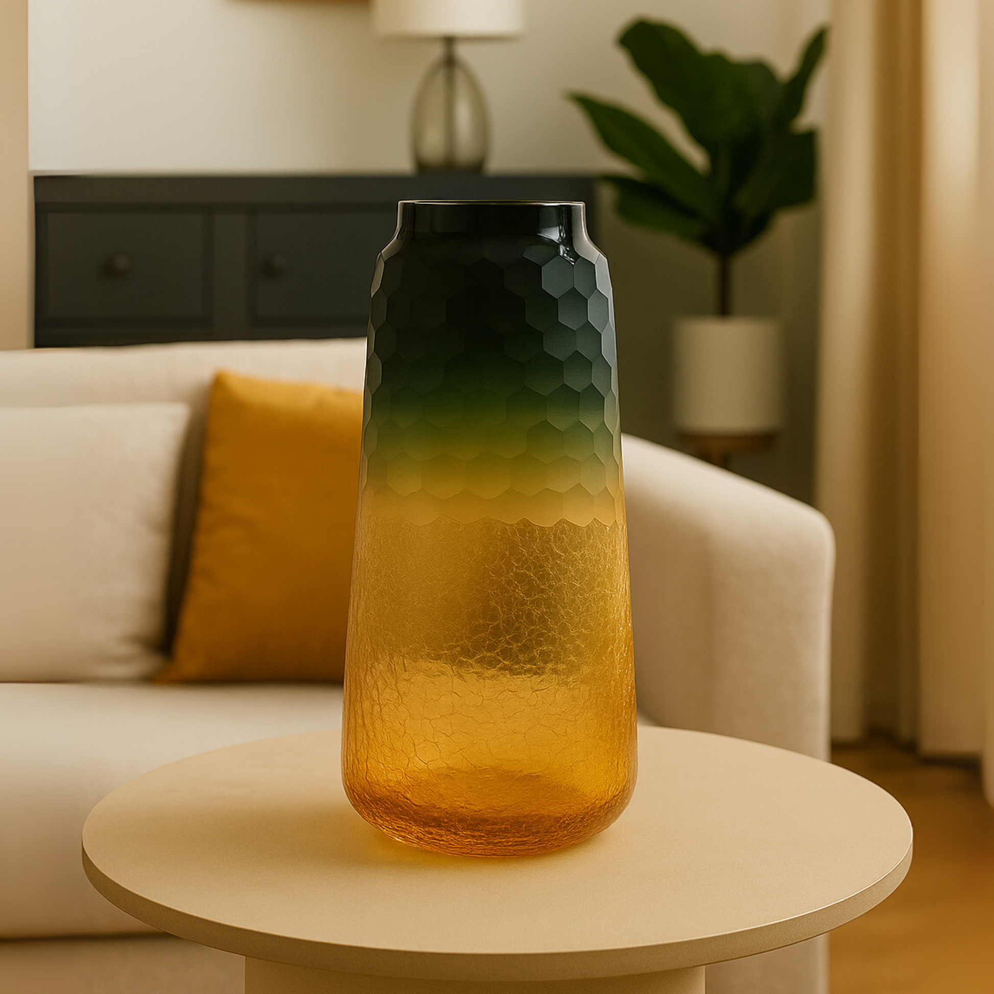 Nature’s Contrast, Artful Form - The Forest Ember Glass Vase blends deep green and warm amber tones in a graceful silhouette, capturing the spirit of woodlands at sunset. A striking piece for natural or bohemian interiors.