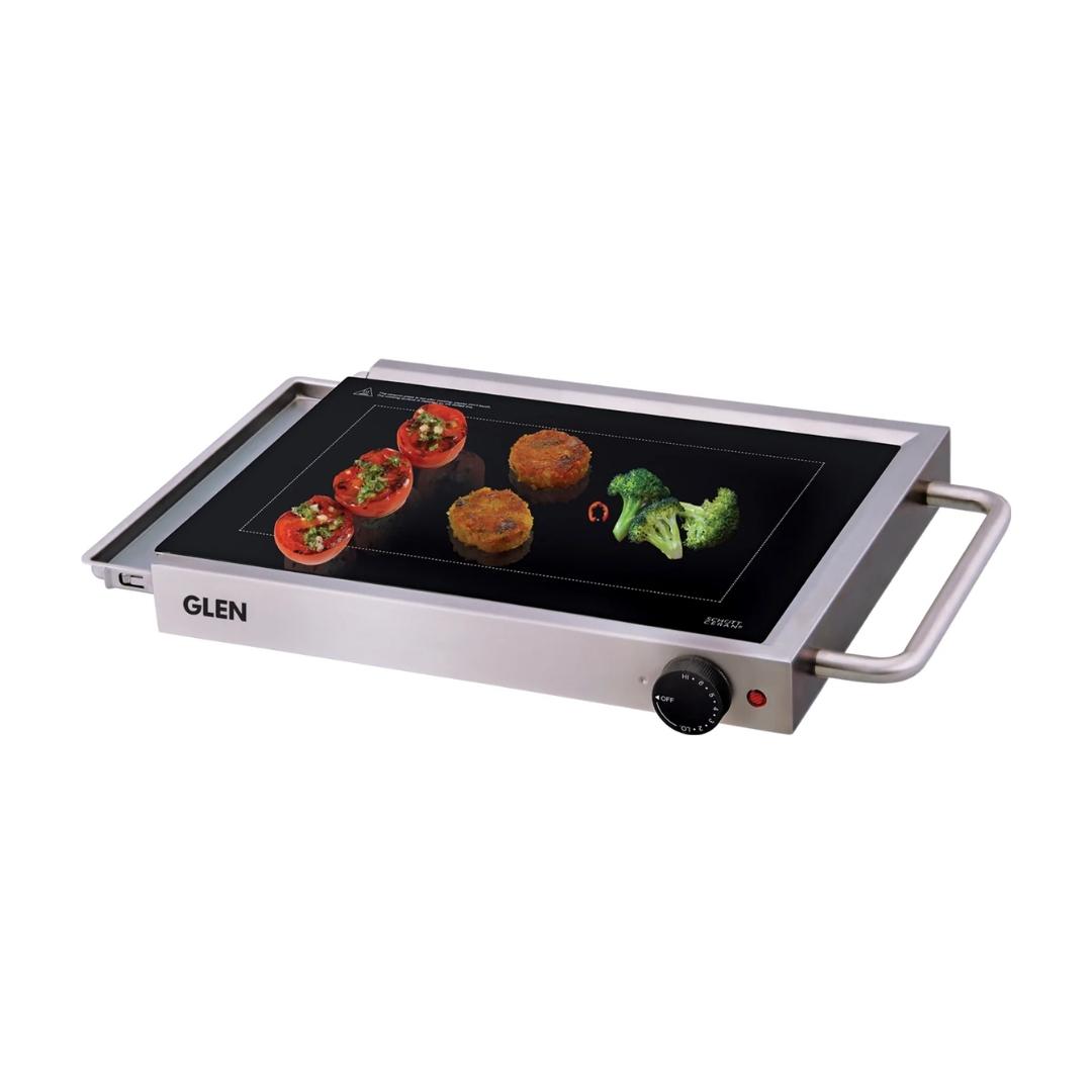 - The Glen 3033 Glass barbeque grill allows healthy cooking and grilling directly on glass with less oil. It has large glass area for convenient accommodation of vegetable or meats. Equipped with easy to clean detachable oil tray, this glass grill saves from the hassles of mess. It also has a temperature control knob with thermostat to set according to the requirement and recipe. The stainless steel housing and handle ensures adequate safety of the user.
