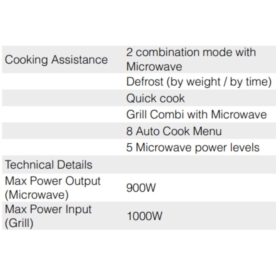 - Cooking Assistance : 2 combination mode with Microwave, Defrost (by weight / by time), Quick cook, Grill Combi with Microwave