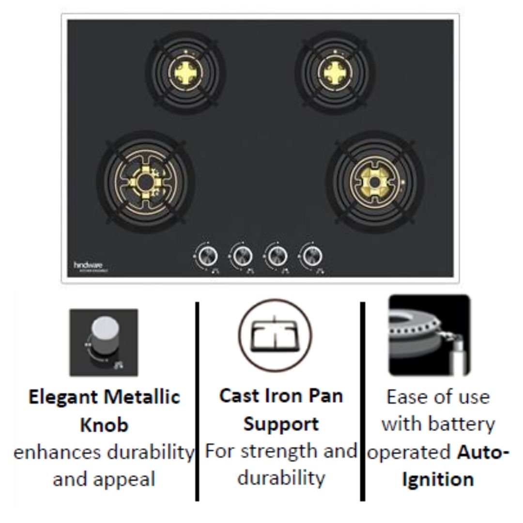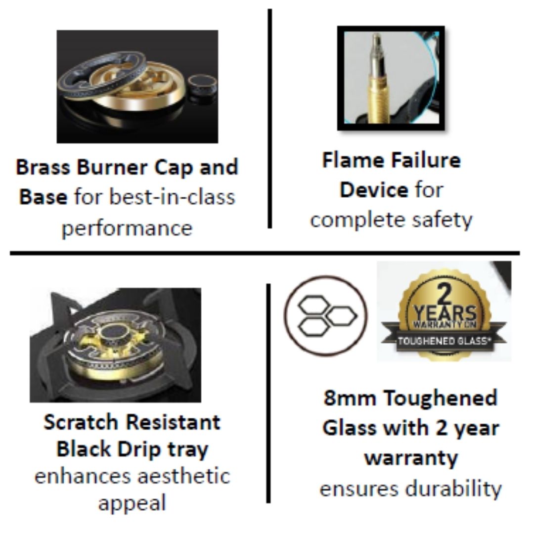 - All Burners with Flame Failure Device (FFD): Flame Failure Device prevents accidental gas leakage. In case if while cooking the flame goes off due to any reason like spillage or wind then safety device / FFD immediately cuts off the gas supply to the burner and prevents gas leakage