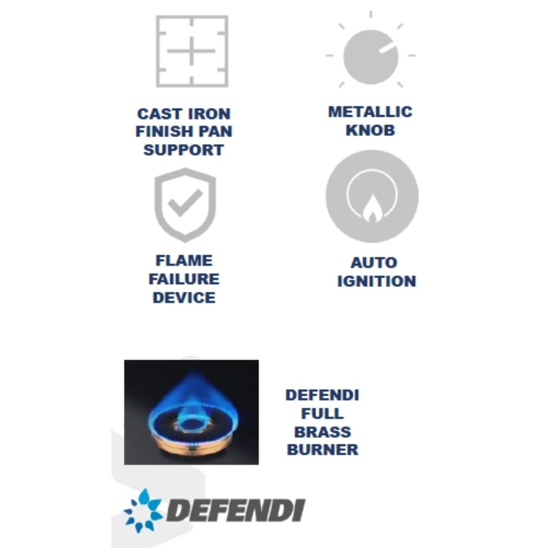 - 4 Burners : 1 Triple ring 4.0 KW + 1 Large 2.8 KW + 1 Medium 1.8 KW + 1 Smaller 1.0 KW