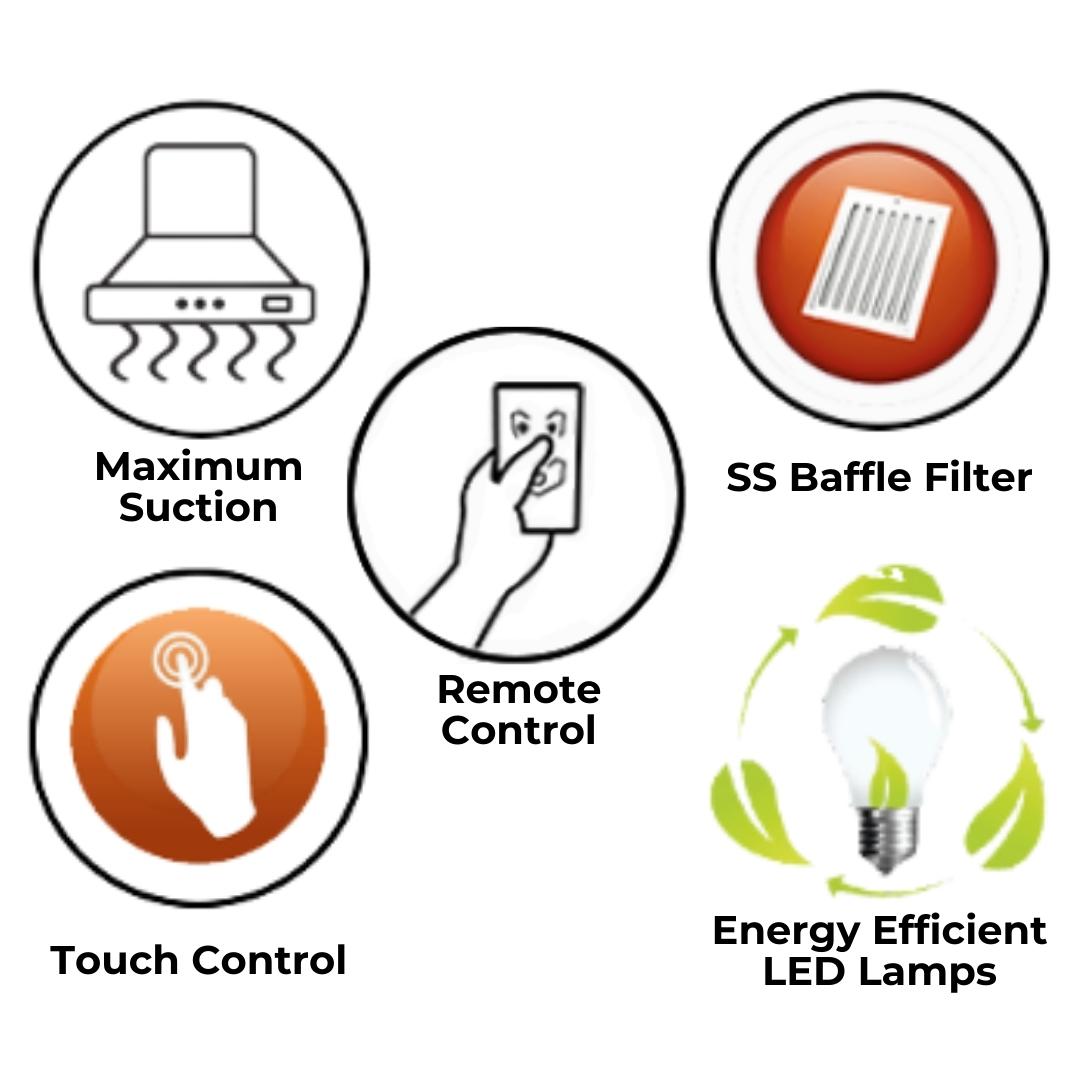 - Baffle Filter : Made from stainless steel, our chimneys come with baffle filters which effectively push the oil and residue to collect inside the baffle.