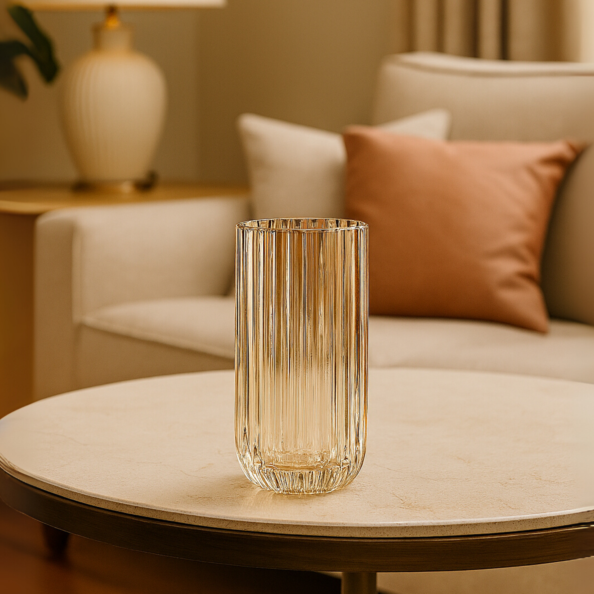 Amber Elegance - This luminous cylinder Glass Vase in warm honey glass adds instant warmth and depth to a table or shelf. A stunning contrast against fresh greens or white blooms.