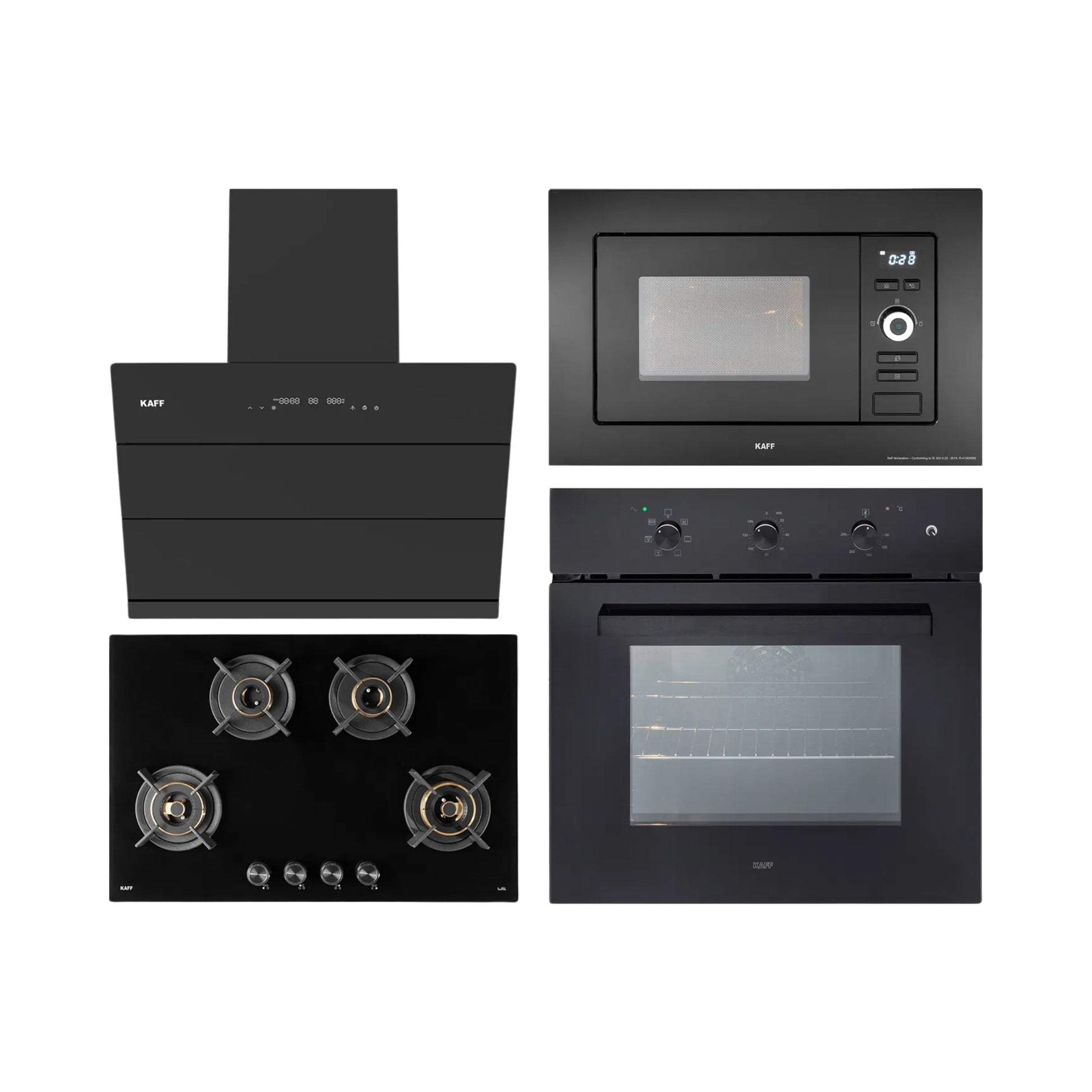 Kaff Built In Oven OV 83 ML7 + Kaff Built-In Microwave KMW 5PJ BLK + Kaff 75 cm Wall Mounted Chimney ALBURY 75 DC - BLDC + Kaff 80 cm 4 Burner Hob Infra INF 804