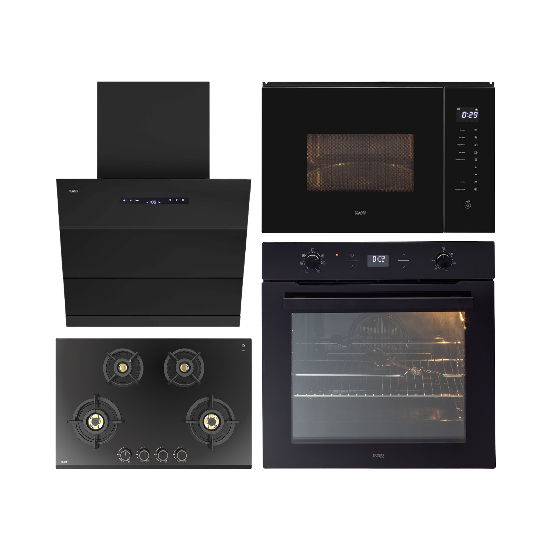 Kaff Built In Oven With Air Fryer OV 81 GIKAFR + Kaff Built-In Microwave KMW HN 6 BLK + Kaff 75 cm Wall Mounted Chimney LYNN 75 DC BLDC + Kaff 78 cm 4 Burner Hob Ashford ASF 784