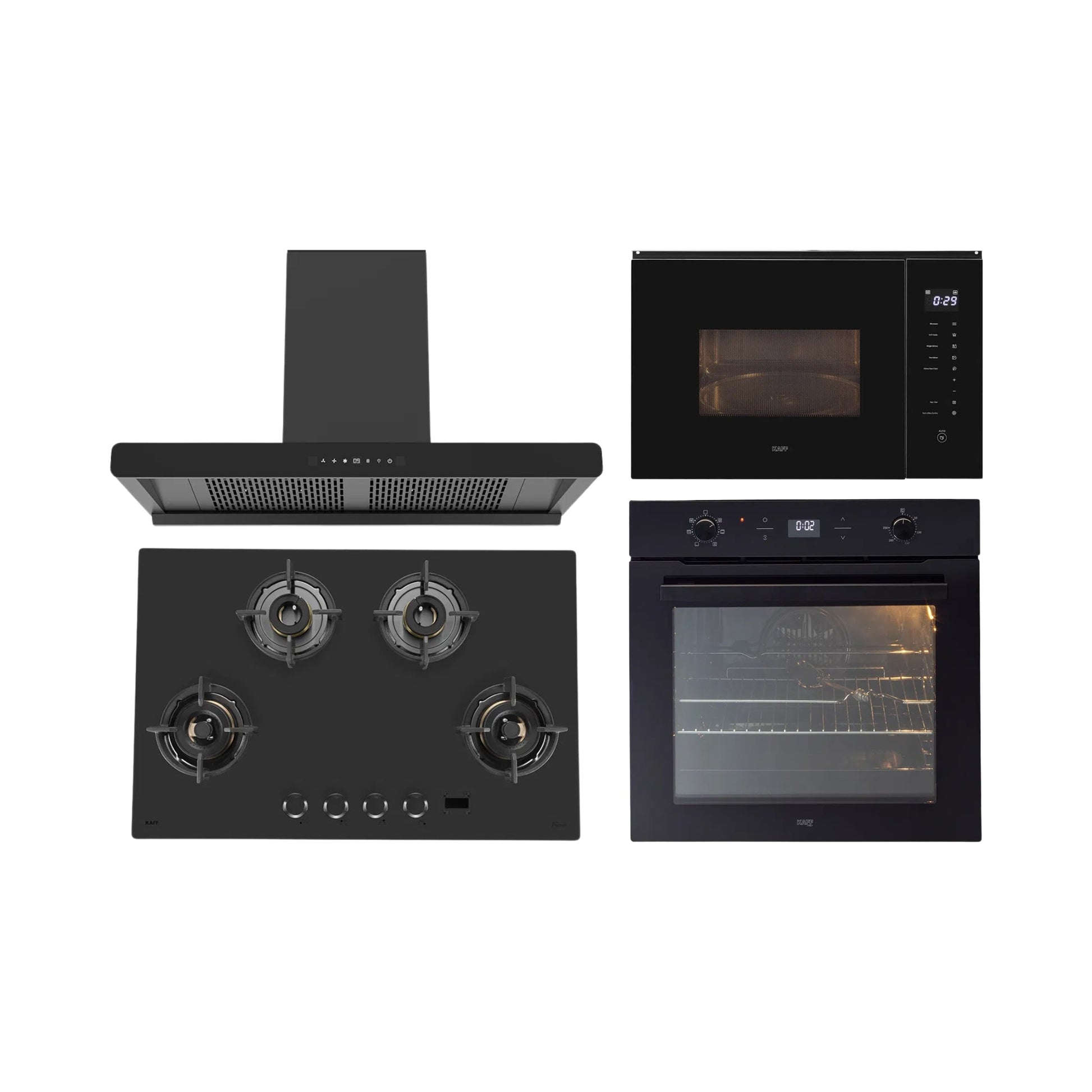 Kaff Built In Oven With Air Fryer OV 81 GIKAFR + Kaff Built-In Microwave KMW HN 6 BLK + Kaff 90 cm Wall Mounted Chimney BRANDO 90 DC BLDC + Kaff 80 cm 4 Burner Hob Preston PRS 804