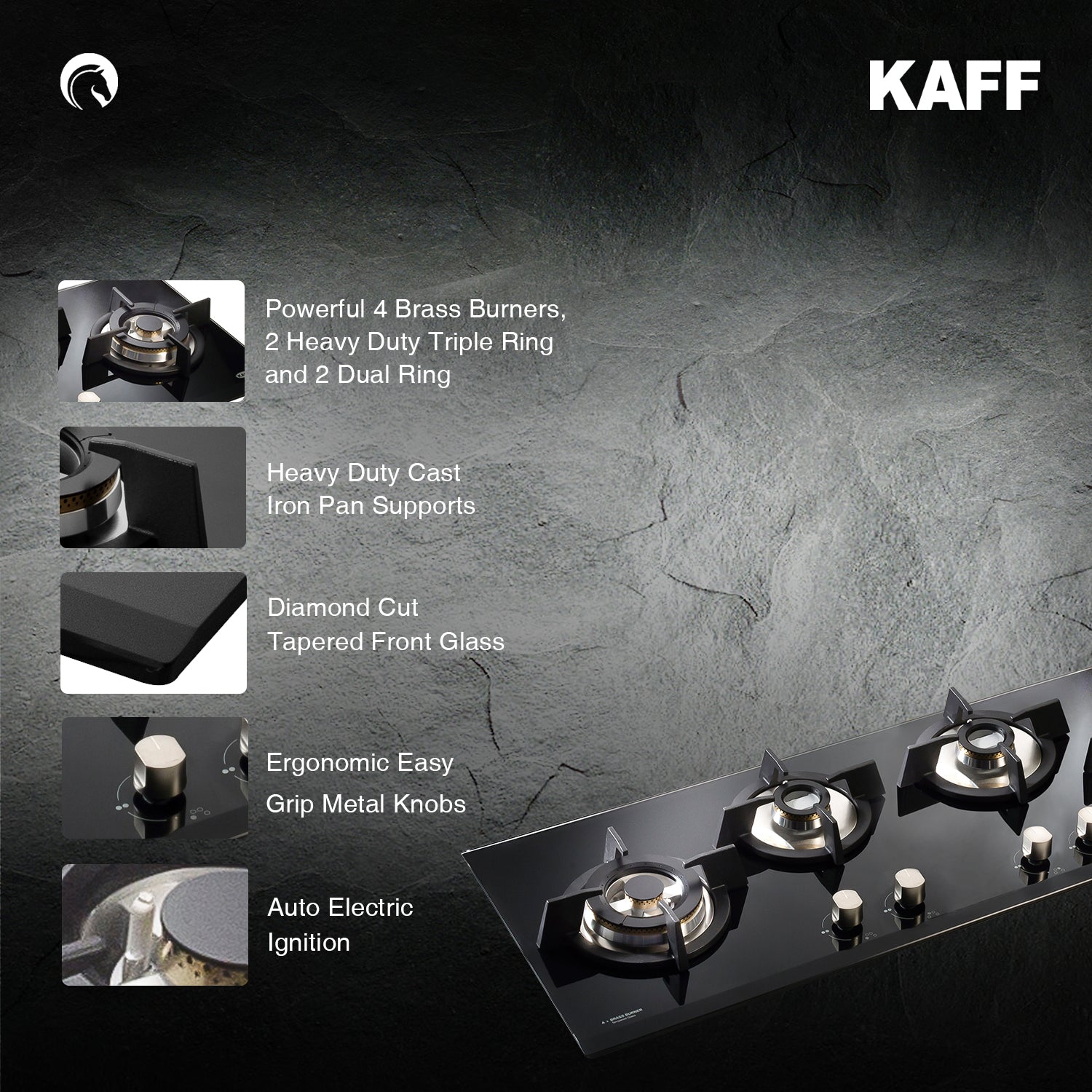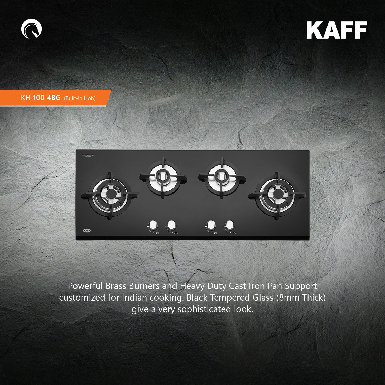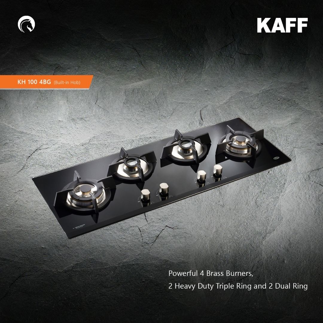 - Powerful 4 Brass Burners, 2 Heavy Duty Triple Ring and 2 Dual Ring Black Tempered Glass (8 mm Thick)