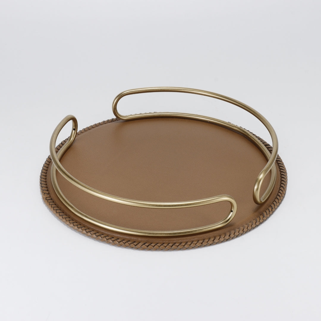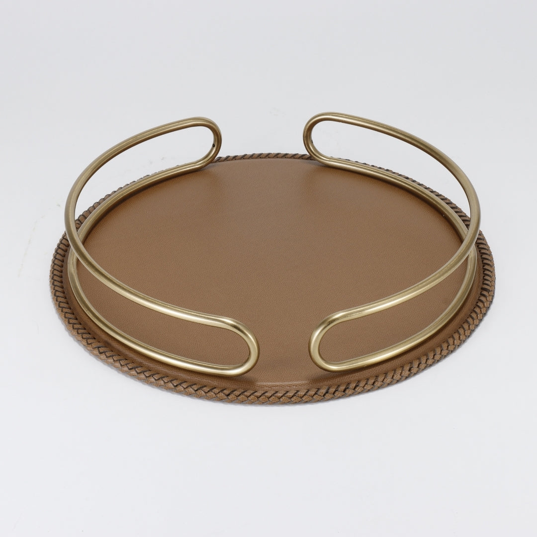 Experience the epitome of opulence with our Lush Brown Oasis: Circular Leather Tray with Circular Gold Iron Protective Handles. This round tray harmoniously blends the lush allure of brown leather with the timeless charm of circular gold iron handles, offering both style and functionality. Each tray in this collection is a testament to meticulous craftsmanship, meticulously designed with supple dark green leather that exudes an understated opulence. The circular gold iron handles not only add a touch of vintage allure but also provide protective elegance, making this tray visually captivating and highly practical. Whether you're serving cocktails with flair or displaying it as a chic decor piece, it effortlessly elevates any setting. Our Lush Green Oasis Circular Leather Tray with Circular Gold Iron Protective Handles is more than just a serving accessory; it's a symbol of timeless refinement and practical luxury. Elevate your serving experience or enhance your decor with this exquisite round tray, where the fusion of dark green leather and circular gold iron handles creates an aesthetic that's both classic and sumptuous, evoking a sense of enduring elegance and opulence.
