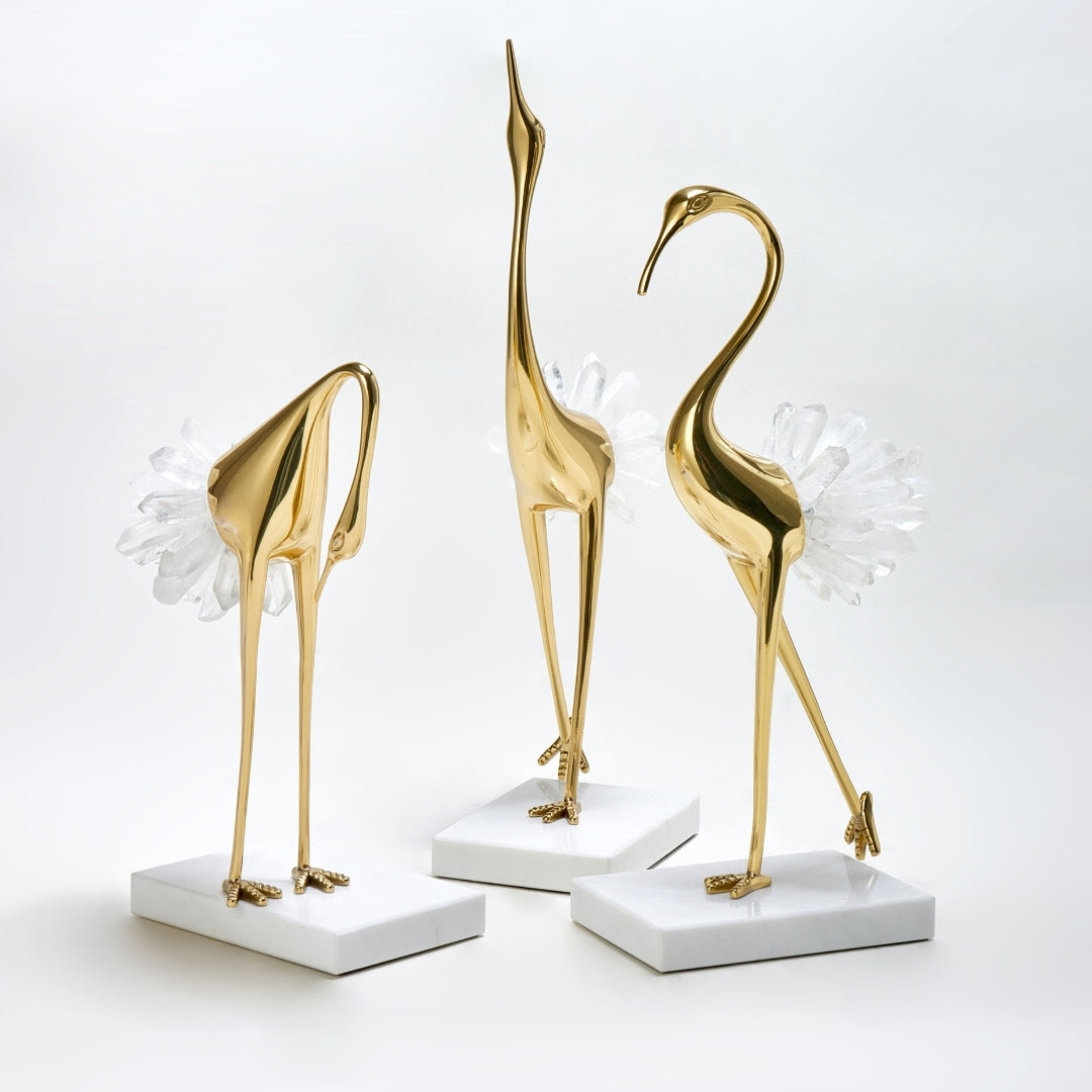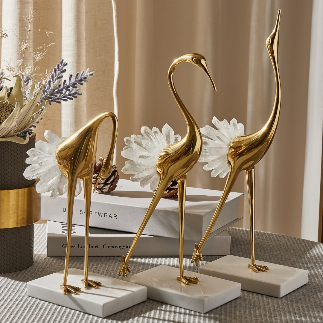 Elevate your decor with the Majestic Elegance: Gold Brass Crane (Head Up), a symbol of grace and poise. Crafted from gleaming brass, quartz, and marble, this exquisite crane sculpture embodies an air of regal elegance. With its head held high, it symbolizes confidence and grace. Whether displayed on a tabletop or as a centerpiece, let this majestic crane evoke a sense of majesty and refined beauty in your surroundings, adding a touch of opulence to your decor.