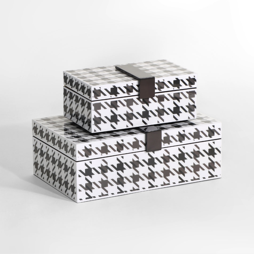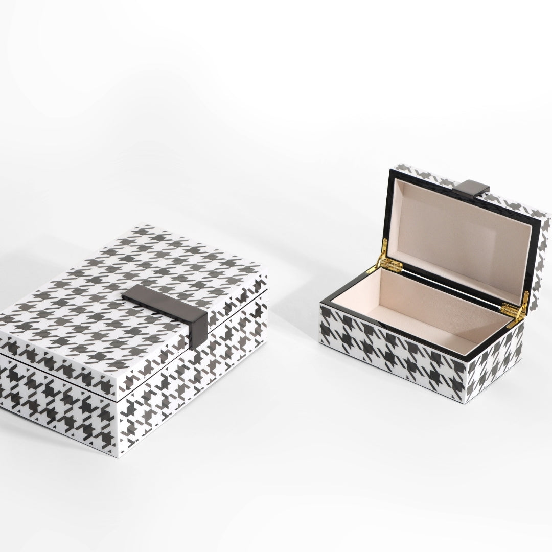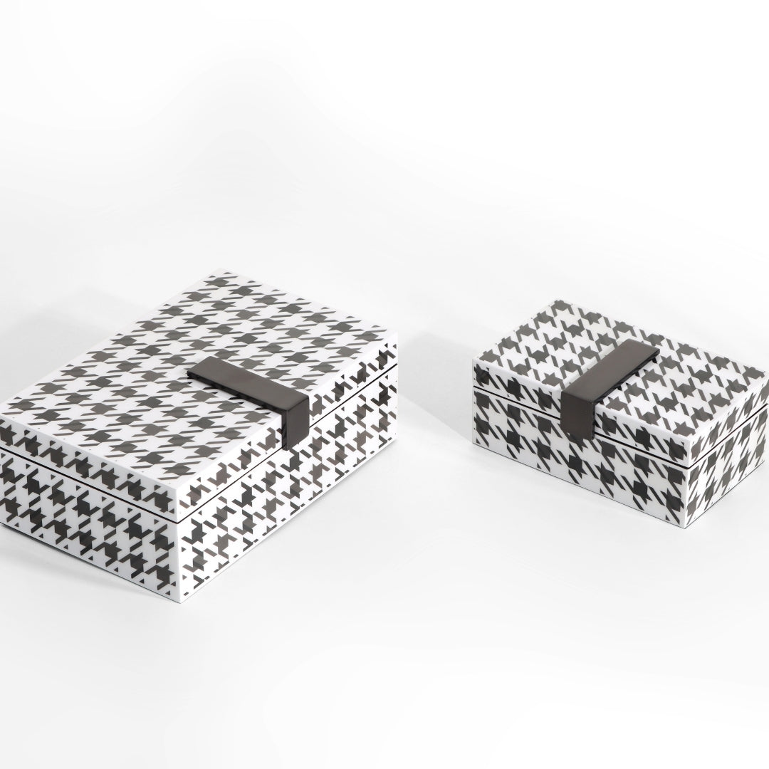 Elevate your organization game with our Monochrome Houndstooth Rectangular Boxes. Crafted with precision and adorned with a timeless black and white houndstooth pattern, these boxes add a touch of classic sophistication to your living space. Their spacious interiors and iconic design make them a standout addition to your decor. Embrace the perfect blend of style and functionality as you immerse yourself in the world of elegant organization.