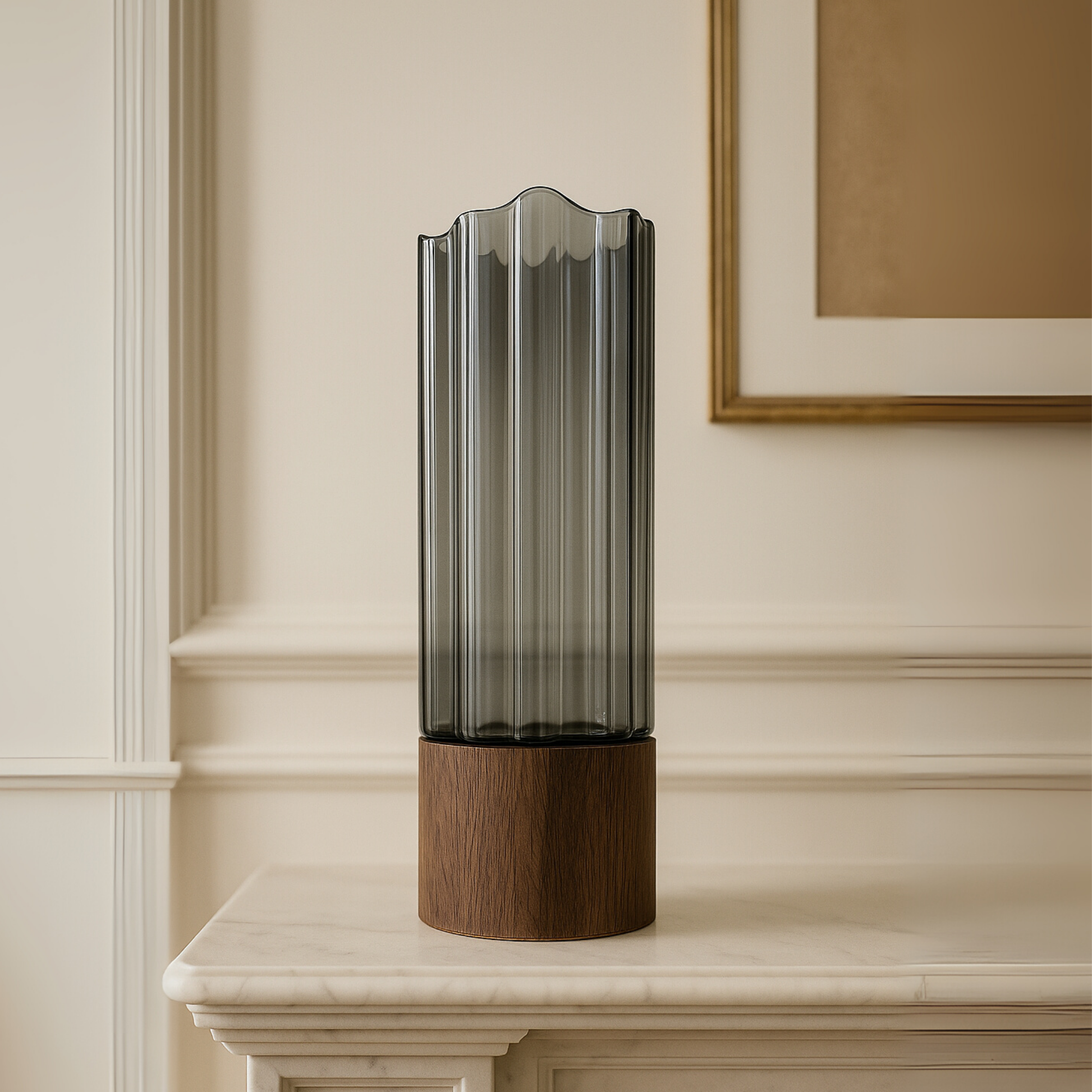 Scandinavian Simplicity - Inspired by Nordic interiors, the Nordic Shade combines frosted grey glass and pale oak for a clean, serene aesthetic. Ideal for understated arrangements or as a stand-alone design piece.
