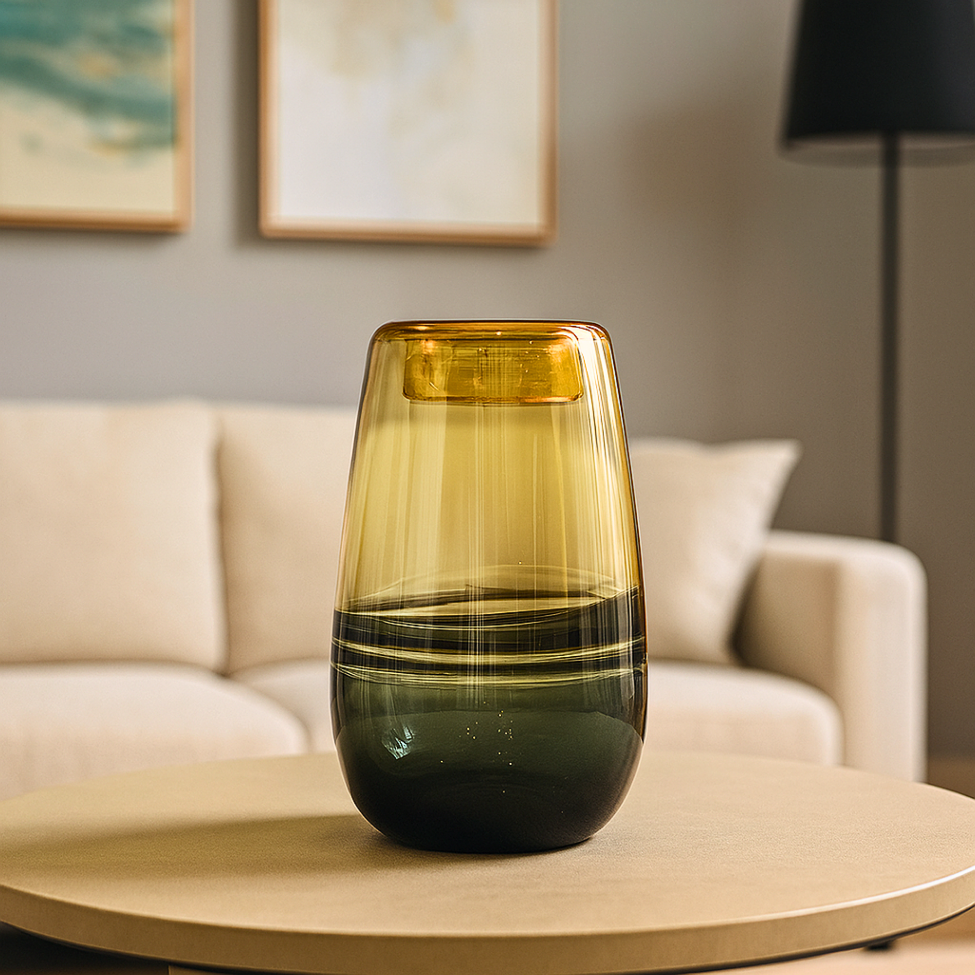 Warm Light, Cool Form - The Smokeglow Glass Vase brings together the glowing warmth of amber with the smoky mystery of grey in a rounded, elegant shape. Pairs beautifully with natural florals or pampas grass.