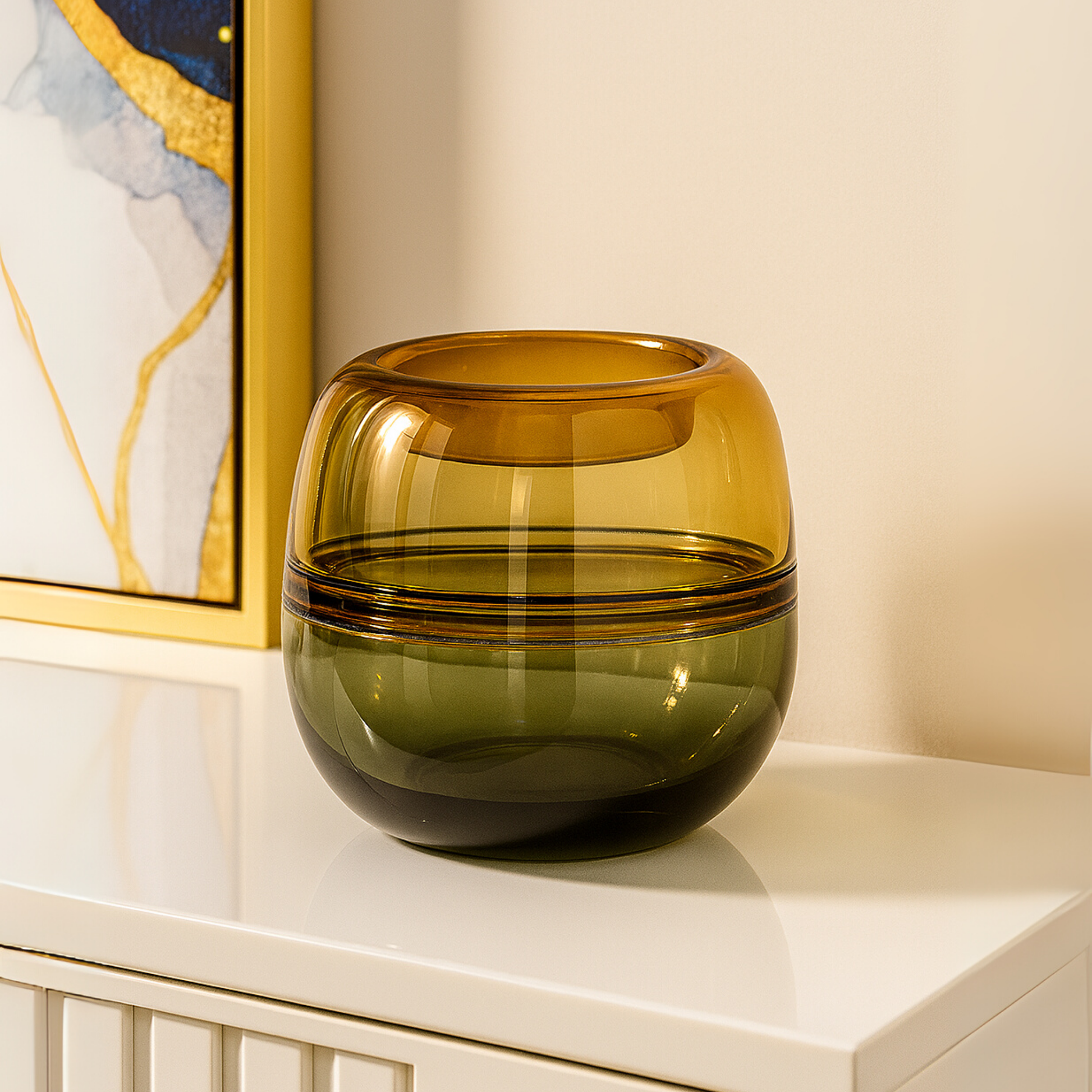 Warm Light, Cool Form - The Smokeglow Glass Vase brings together the glowing warmth of amber with the smoky mystery of grey in a rounded, elegant shape. Pairs beautifully with natural florals or pampas grass.