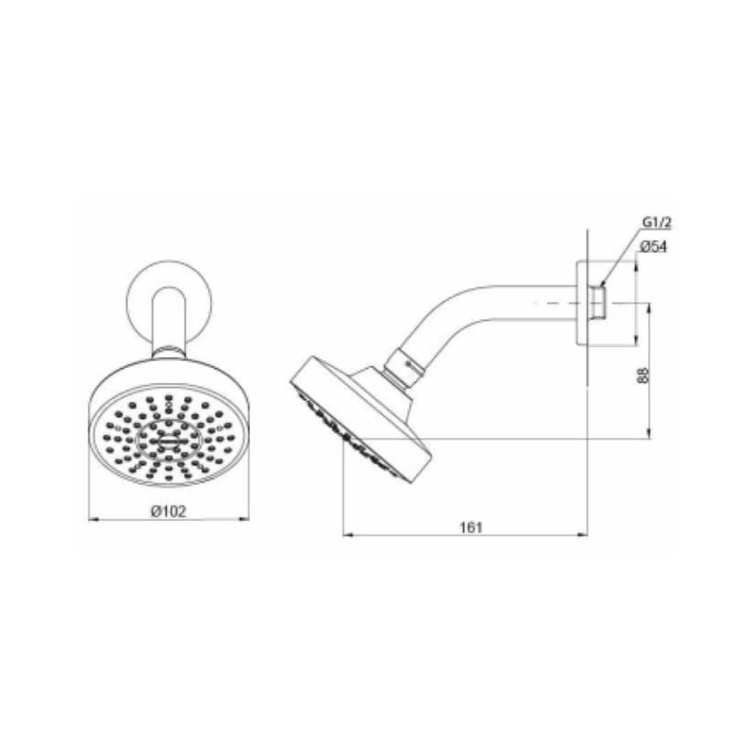 - Over Head Shower, Round, Standard, 1 Mode With Shower Arm
